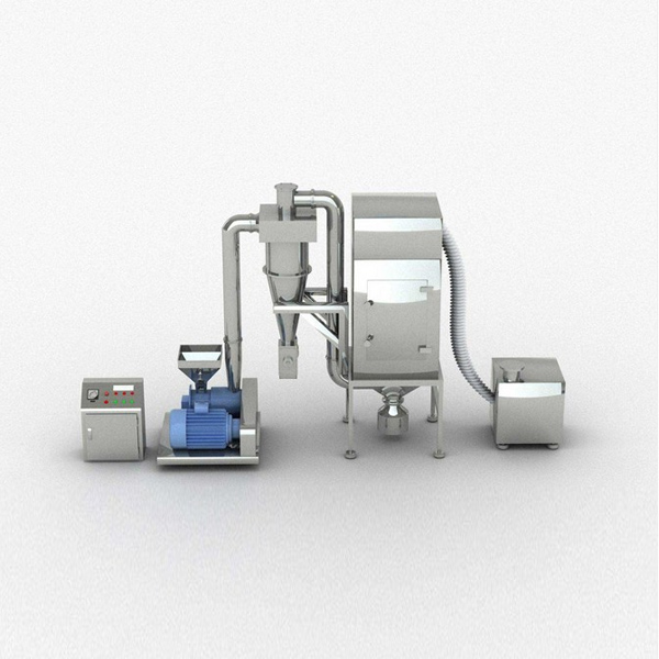 该机由加料斗、分级轮、粉碎刀片、齿圈、粉碎电机、出料口、风叶、集料箱、吸尘箱等部分组成。物料由加料斗进入粉碎室,通过高速旋转的刀片进行粉碎,调节分级轮与分级盘的距离来达到所要求的物料细度,高速旋转的风叶把达到要求的物料从粉碎室引到旋风分离器出料,没有达到要求的物料继续在粉碎室中粉碎。旋风分离器的粉尘由脉冲除尘箱收集后回收利用。该机组按“GMP”标准设计,结构简单、操作清理方便、噪音小、产量高、机器全部用优质不锈钢材料制造、粉碎过程中无粉尘飞扬。