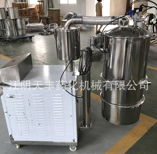 真空加料机由真空泵(无油、无水)、不锈钢吸料咀、输送软管、PE过滤器,压缩空气反吸装置、气动放料门装置、真空料斗和料位自动控制装置等组成,整套系统设计合理、制造精美。